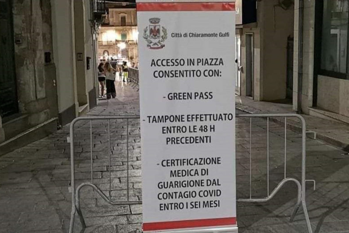 Un cartello su una transenna che vieta il transito nella piazza del centro storico a chi non ha il green pass. E’ stato posizionato dall’amministrazione comunale di Chiaramonte Gulfi, piccolo centro collinare di quasi ottomila abitanti in provincia di Ragusa, per contrastare i contagi da Coronavirus. Così, almeno secondo quanto indicato in un cartello piazzato su una transenna, il sindaco Sebastiano Guerrieri ha pensato di sbarrare piazza Duomo. Non si tratta di un divieto per il transito delle auto, ma di un’ordinanza vera e propria. Per accedere nel Centro storico, occorre essere immunizzati. Serve il Green pass per potere attraversare il Duomo di Chiaramonte o l'esito del tampone negativo effettuato nelle ultime 48 ore.