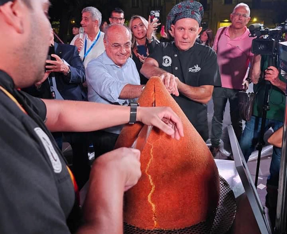 Il megarancino ha raggiunto il peso di 56,200 chili per 60 cm di altezza e 55 cm di diametro, superando ampiamente il precedente record di 32,7 Kg ottenuto nel 2019 a Catania. La scenografica cottura nella grande pentola, la pesata e la verifica degli ingredienti dopo aver aperto l’arancino, sono stati i momenti clou, sotto l’occhio vigile del rigoroso giudice Lorenzo Veltri, coadiuvato dall’ispettore metrico Salvatore Ciulla e dalla biologa Rosalba Comerci.