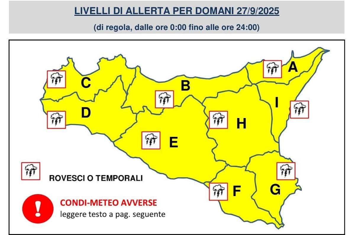 La Protezione Civile Regionale della Sicilia ha emesso un bollettino di allerta meteo per la giornata di oggi, sabato 27 settembre 2025, a causa di un’ondata di maltempo che interesserà l’isola.