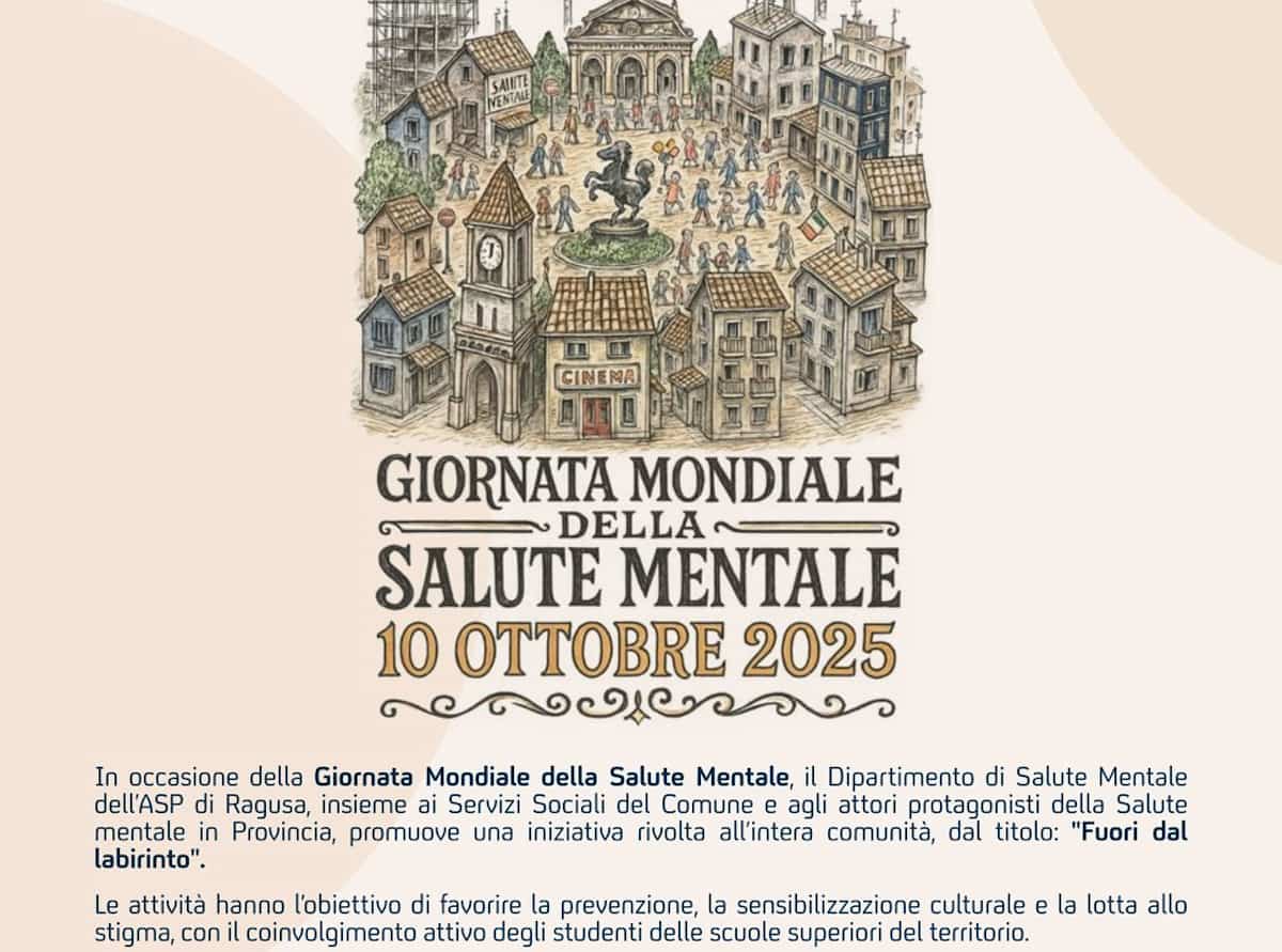 Sempre nella giornata del 10 ottobre, presso il Centro Commerciale culturale di via Matteotti 61, a Ragusa, si terrà un’iniziativa a cura del Dipartimento di Salute Mentale diretto dal dottor Pino Morando, in collaborazione con i Servizi sociali del Comune e gli Enti del Terzo Settore. Si intitola “Fuori dal labirinto”: sono previsti punti informativi, laboratori artistici e culturali, reportage fotografici e un momento istituzionale con un focus sulla salute mentale tenuto da professionisti del settore e arricchito dai contributi dei ragazzi delle scuole. Alle 12 ci sarà poi il collegamento in streaming, promosso dal Collegio Nazionale Dipartimenti di Salute Mentale, con le piazze di tutta Italia in cui si svolgono analoghe iniziative.