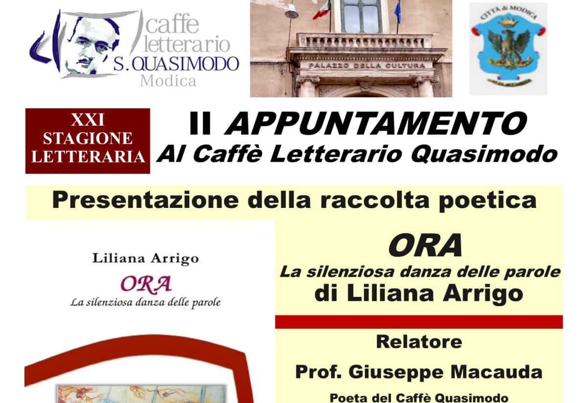 Modica – Sarà dedicato alla poetessa agrigentina Liliana Arrigo il sabato letterario del Caffè Quasimodo, che si terrà il prossimo il 18 ottobre al Palazzo della Cultura, alle ore 17.30. Al centro della serata il libro di poesie “ORA. La silenziosa danza delle parole”, che avrà come relatore il prof. Giuseppe Macauda, poeta del Caffè Quasimodo. L’incontro sarà arricchito dalle letture di Giovanna Drago e Rosanna Giannone, componenti del Caffè Quasimodo, e dalle note al pianoforte di Grazia Colombo.