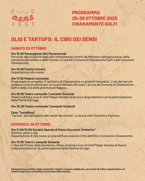 A farla da padrona però, sarà un prodotto particolare, il tartufo, che verrà presentato come prodotto innovativo del territorio per un nuovo “mercato del lusso”. La presentazione si svolgerà presso il Palazzo Comunale anche alla presenza della CNA, promotrice del food mama fest. Come da format dell’evento, seguirà lo show cooking a cura dello chef Peppe Venezia, allestito al teatro “Leonardo Sciascia”, in collaborazione con “le mamme” di oggi. A concludere la giornata del sabato, il “taste and buy” dal tema : “tartufo: dal Gattopardo alle tavole del mondo”. Si continuerà anche domenica 26 ottobre, a cominciare dalle ore 11, presso “Società Operaria di mutuo soccorso Umberto I”, per degustare il pane e l’olio nuovo a cura dell’Associazione Città dell’olio e del Consorzio Chiaramonte. Alle ore 13 infine, “l’idea di pranzo della Domenica”, show cooking a cura dello chef Peppe Venezia e delle mamme di oggi.