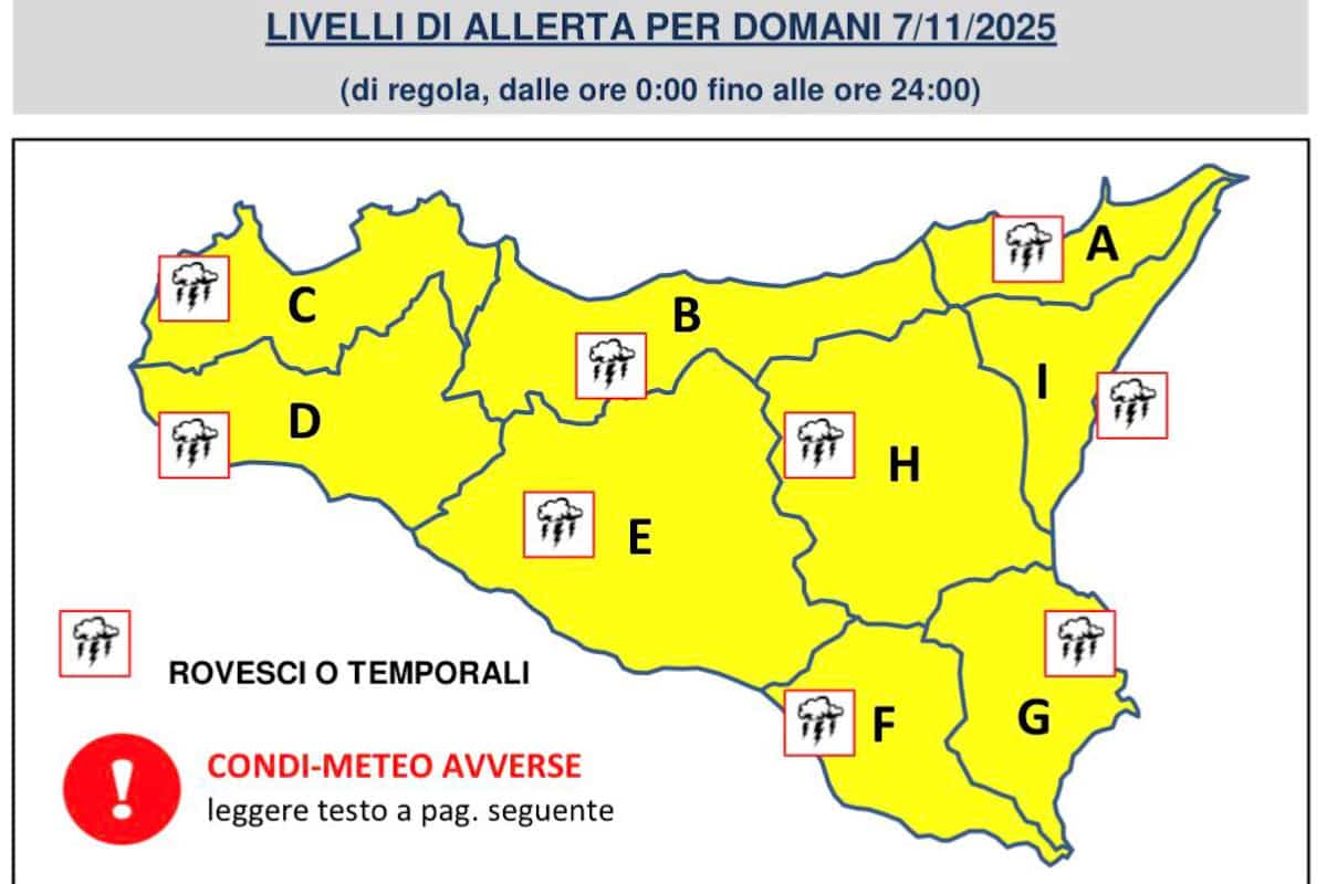 Maltempo. La Sicilia si prepara a fronteggiare una nuova ondata di maltempo. La Protezione Civile Regionale ha emesso un’Allerta Gialla valida per la giornata di domani, venerdì 7 novembre 2025, a causa dell’arrivo di un fronte perturbato che porterà piogge intense e fenomeni temporaleschi.