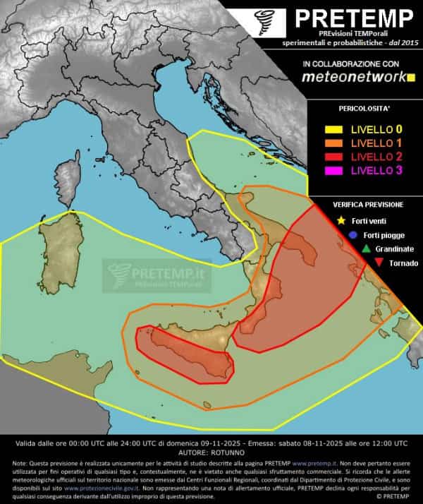 L’instabilità atmosferica dominerà il panorama meteorologico di oggi, domenica 9 novembre, con il rischio di temporali intensi e, localmente, nubifragi. In queste ore il maltempo è già arrivato in provincia di Catania, Messina, Caltanisetta.