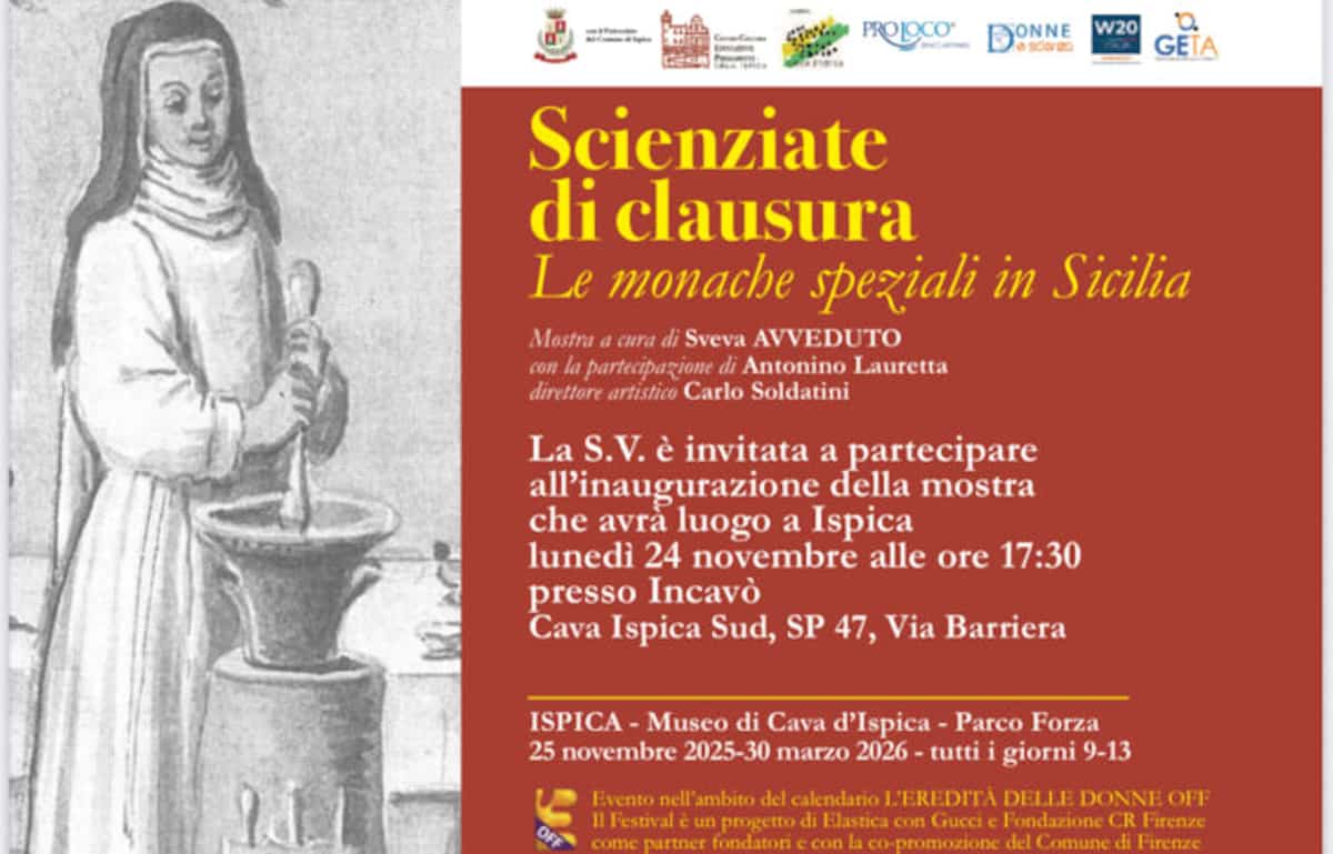 Ispica – “Scienziate di clausura – Le monache speziali in Sicilia”. Questo il tema della mostra, organizzata dalla Pro Loco Spaccaforno, che verrà inaugurata lunedì 24 novembre 2025 ore 17,30 presso Incavò, Cava Ispica Sud.