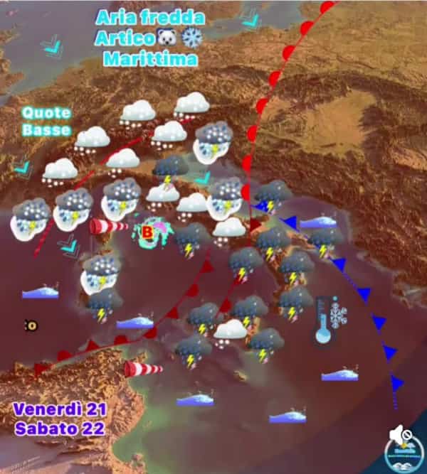 La Penisola Italiana si prepara a fronteggiare una severa ondata di maltempo invernale a causa della discesa di aria artico marittima da latitudini nord europee. Questa massa d’aria gelida innescherà la formazione di un profondo vortice ciclonico sul Mediterraneo centrale tra la giornata di venerdì e sabato 22 novembre 2025. Lo annunciano le previsioni meteo di Marco Gelfo de Il Mio Meteo Sicilia (vedi foto).
