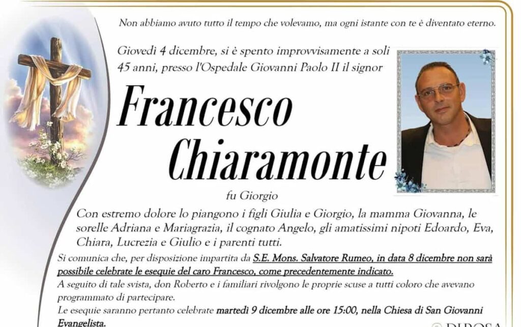 La data delle esequie è stata modificata dal precedente annuncio di lunedì 8 dicembre, su disposizione impartita da S.E. Mons. Salvatore Rumeo.