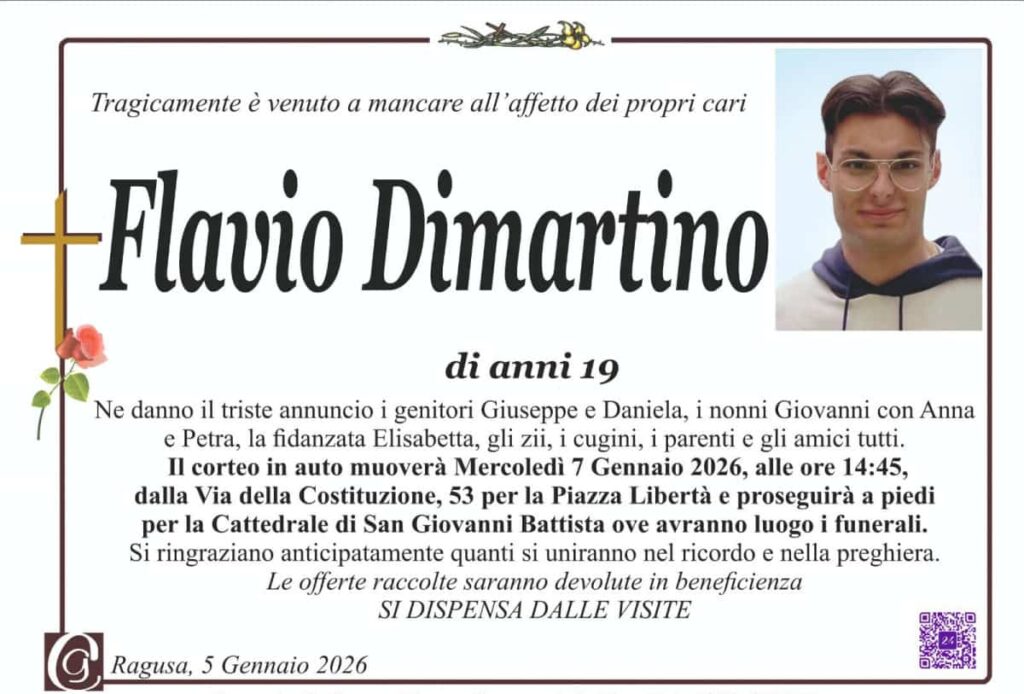 Ragusa – Si terranno domani, mercoledì 7 gennaio, i funerali di Flavio Dimartino, il diciannovenne ragusano rimasto vittima di un tragico incidente stradale lo scorso 27 dicembre. La comunità si stringerà attorno alla famiglia alle ore 15:00, presso la Cattedrale di San Giovanni Battista, per l’ultimo saluto a un giovane la cui scomparsa ha destato profondo commozione in tutta la città.