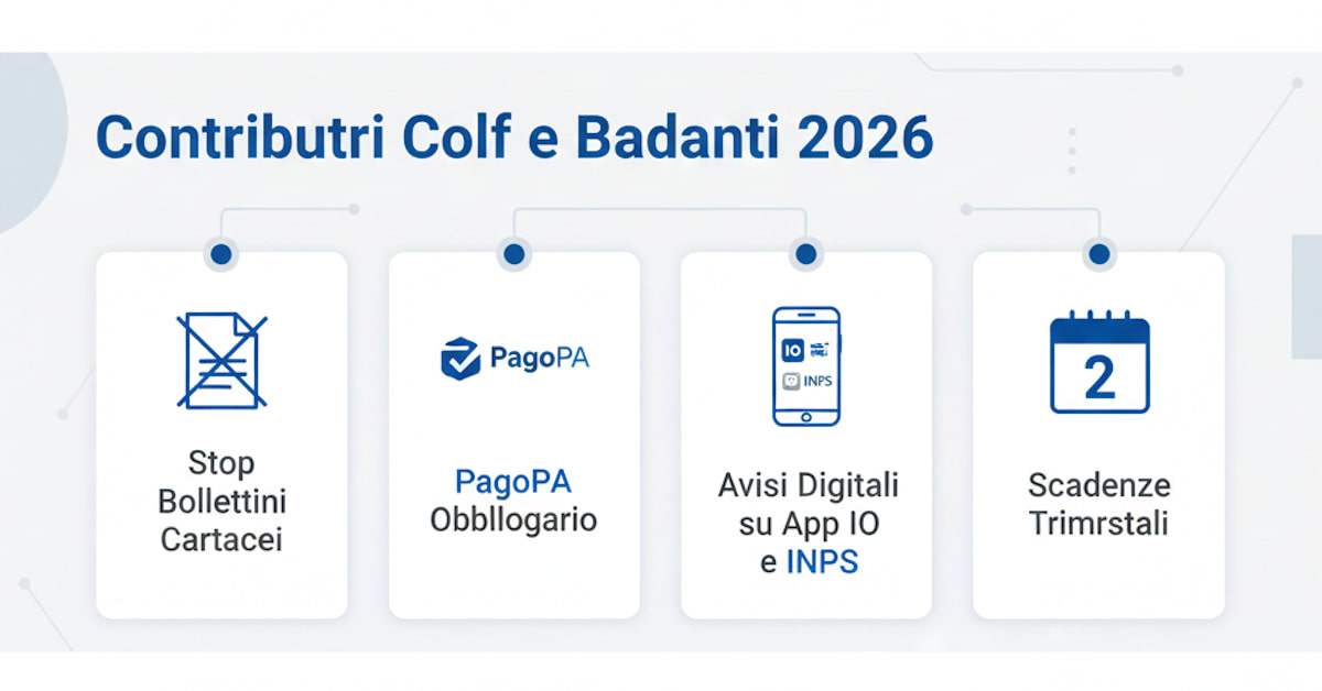 Infografica che riassume le principali novità sui contributi colf e badanti 2026: PagoPA, avvisi digitali e scadenze.