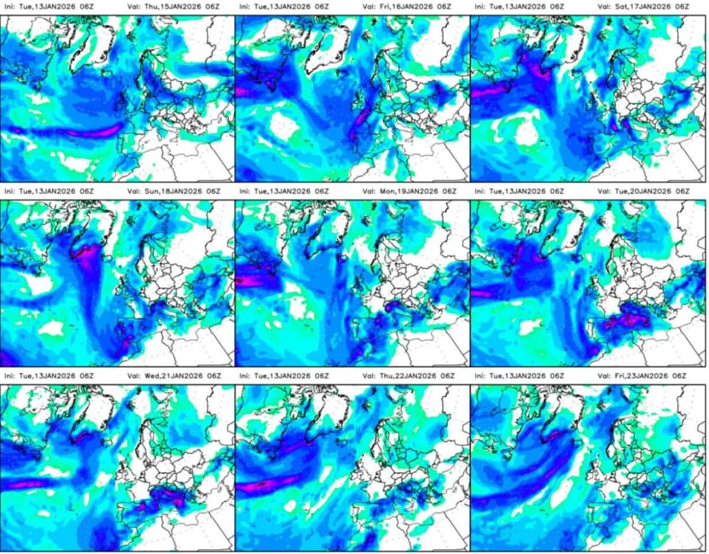 Secondo i modelli di Meteo Web, (vedi foto sotto) l’Italia sarà colpita da due distinti impulsi ciclonici tra il 16 e il 21 gennaio: