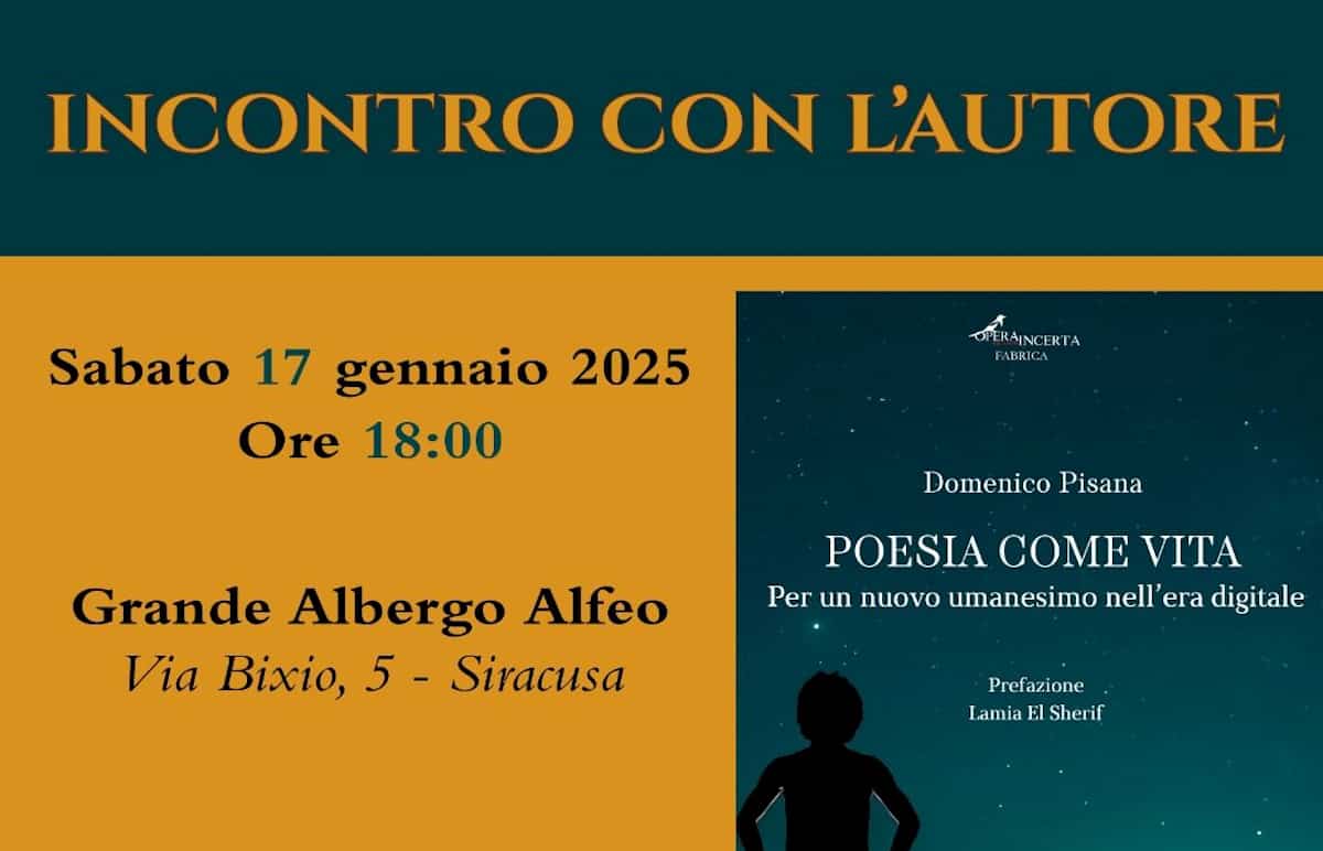 Organizzata dagli Amici della Dante di Siracusa, si terrà sabato 17 gennaio, alle ore 18.00 presso il Grande Albergo Alfeo della città, una serata dedicata al poeta e scrittore modicano Domenico Pisana. Si parlerà della sua attività letteraria, con particolare attenzione al libro “Poesia come vita. Per un nuovo umanesimo nell’era digitale”, recentemente presentato dalla prefatrice Lamia El Sherif presso l’Istituto Italiano di Cultura in Egitto, per iniziativa della BUC Badr University in Cairo.