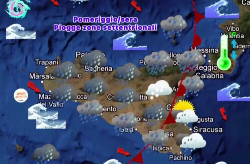 - Pomeriggio: Il cuore del maltempo si sposterà verso il Nord della Sicilia. Sono attesi temporali di forte intensità e nubifragi localizzati sui settori settentrionali, mentre sul resto dell’Isola si apriranno parziali schiarite con piogge più sporadiche.