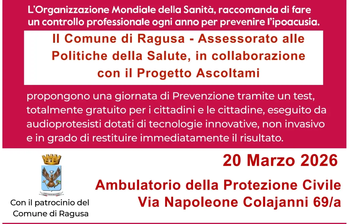 Ragusa – Prendersi cura del proprio udito significa prendersi cura di sé. Con questo spirito, continua l’attività legata alla prevenzione da parte dell’Assessorato alle Politiche della Salute del Comune di Ragusa, in collaborazione con il Progetto “Ascoltami” e con il supporto di Amplifon, promuove una giornata dedicata alla prevenzione dell’ipoacusia. Questa iniziativa segue quelle relative all’aderenza terapeutica e agli screening gratuiti oncologici alla mammella.
